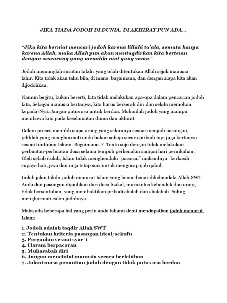Alhamdulillah alloh belum mempertemukan saya dengan jodoh saya, mungkin alloh mau saya fokus memperbaiki diri dulu agar mendapat jodoh yang baik pula. Amalan cepat mendapatkan jodoh dalam islam. Doa enteng jodoh dalam islam yang akan kami sampaikan ini merupakan sebuah usaha yang bisa anda lakukan untuk mendekatkan jodoh anda. Amalan jodoh secara islam ini insyaallah bisa menjadi solusi bagi anda yang belum kunjung juga menemukan pendamping hidup yang tepat. Dalam islam, jodoh, mati dan rejeki adalah tiga hal yang mutlak dimiliki oleh manusia yang diberikan atas kemurahan hati dari allah subhana hua ta'ala.